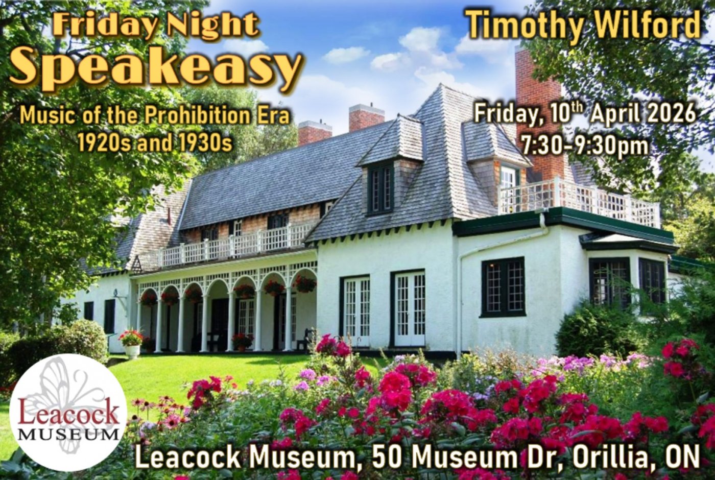 This spring, enjoy the Roaring 20s in style at the Leacock Museum in Orillia, where Timothy Wilford will be performing songs of the Jazz Age. Tour the splendid homestead of celebrated writer Stephen Leacock and see exhibits on the Prohibition Era. The solo-singing performance is on Friday, 10th April 2026, 7:30-9:30pm.