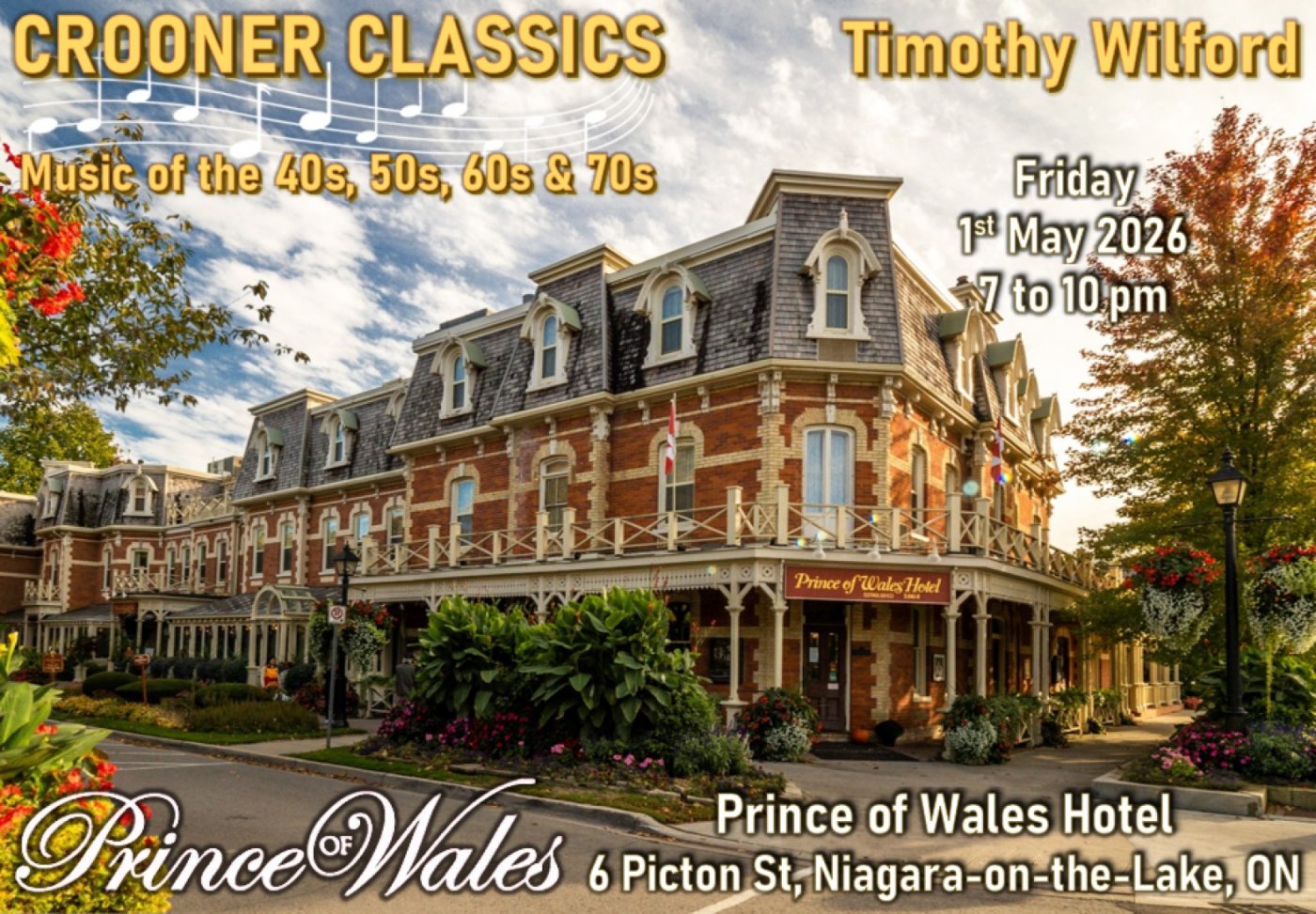 Enjoy fine dining and music at the splendid PRINCE OF WALES HOTEL in Niagara-on-the-Lake, where Timothy Wilford will be performing Friday, 1st May 2026, 7-10pm. Hear crooner classics, including the music of Frank Sinatra, Dean Martin, Bobby Darin, Michael Bublé, and many more!