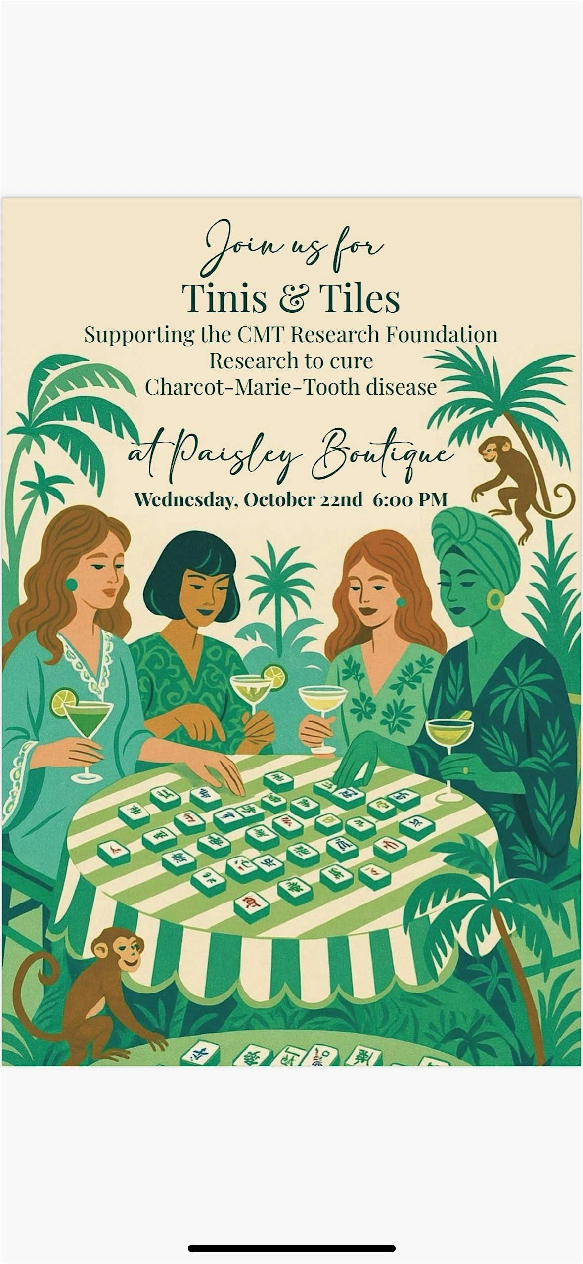 Join us for an evening of mahjong, mingling, wine, beer, and light bites, all in support of the CMT Research Foundation, dedicated to funding research to cure Charcot-Marie-Tooth disease.