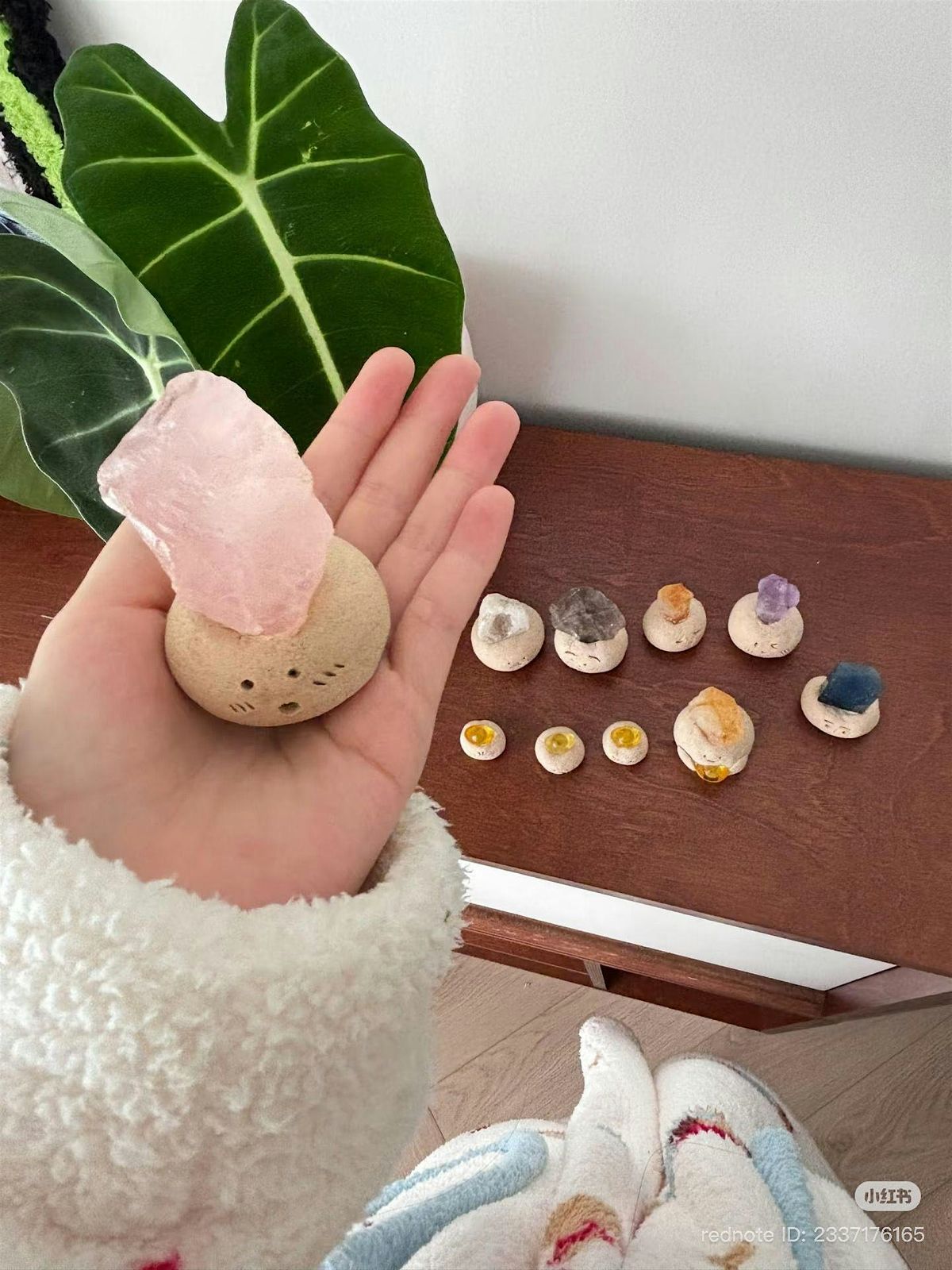 - A small handmade clay piece with a natural crystal on top