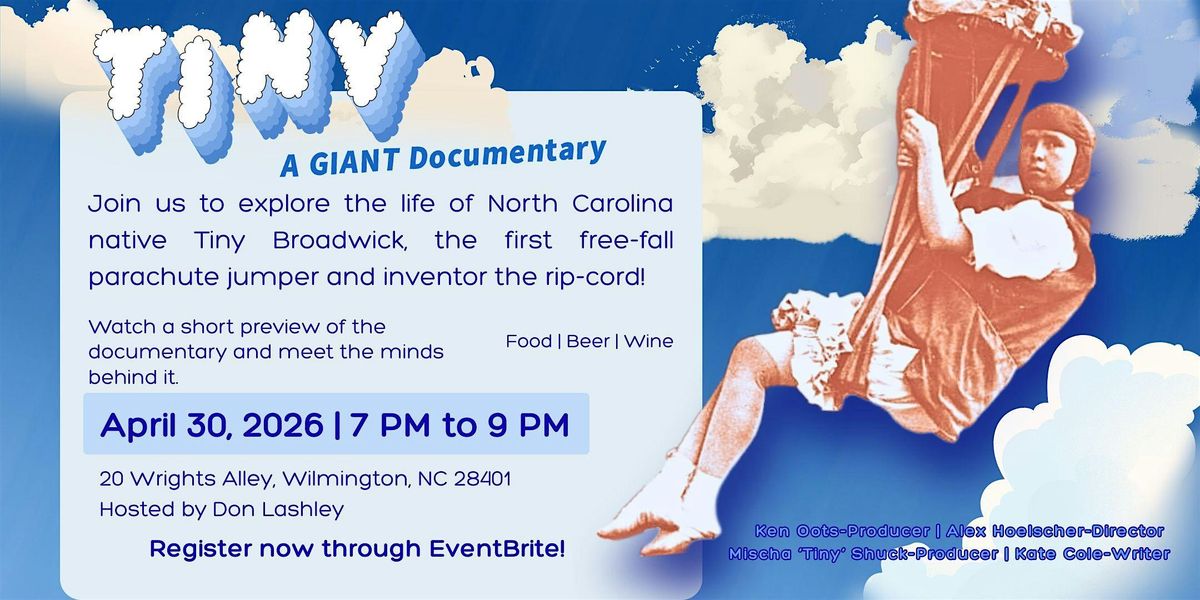 Rip Cord Productions Presents, Tiny. Come join us in person for the Tiny Documentary Fundraiser! Come enjoy a preview of the incredible story of North Carolina native and aviation pioneer Tiny Broadwick. Refreshments, Beer, Wine and food will be provided!