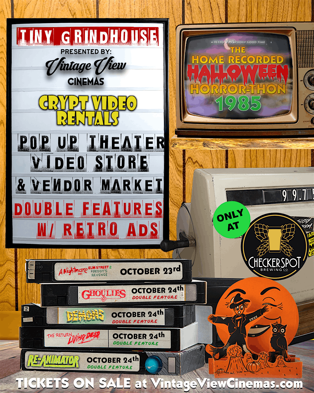 Welcome to a weekend of pure analog bliss: a pop-up micro-cinema, a living video store, and a horror vendor market—under one roof. Tiny Grindhouse teams up Vintage View Cinemas and Crypt Video Rentals at CHECKERSPOT BREWING to deliver two nights of cult classics, deep cuts, and midnight-movie mayhem, complete with retro commercial breaks, vintage trailers, and a lobby that feels like your favorite hometown video shop.Where: Checkerspot Brewing Co. (Baltimore)When: Friday, Oct 24 & Saturday, Oct 25, 2025