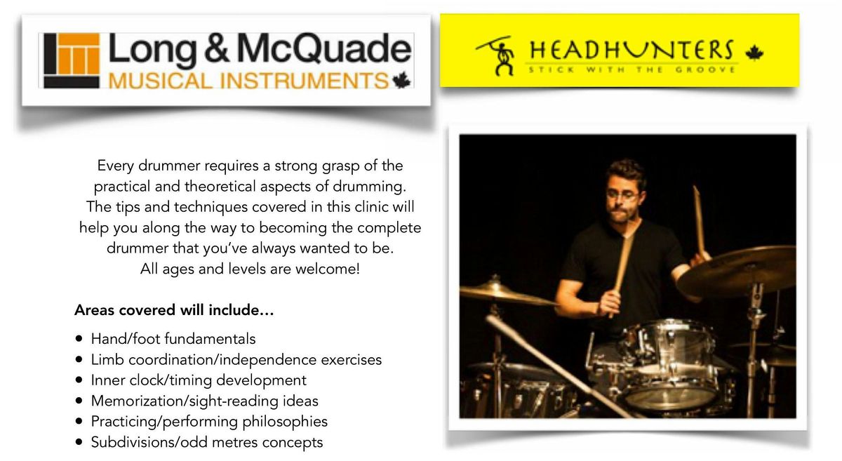 • Hand/foot fundamentals • Limb coordination/independence exercises • Inner clock/timing development • Memorization/sight-reading ideas • Practicing/performing philosophies • Subdivisions/odd metres concepts