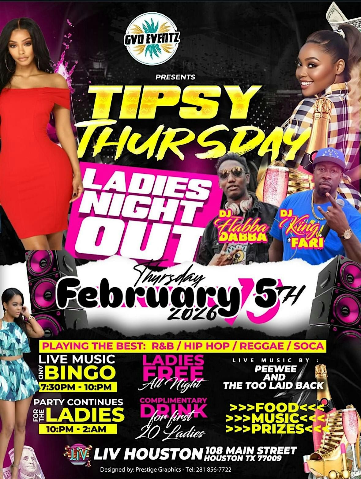 From 7:30 - 10pm come enjoy soothing live music and join in on the fun with bingo. Immediately following will be Tipsy Thursday Ladies Night out party. Free drinks for the first 20 ladies and complimentary food while supplies last.