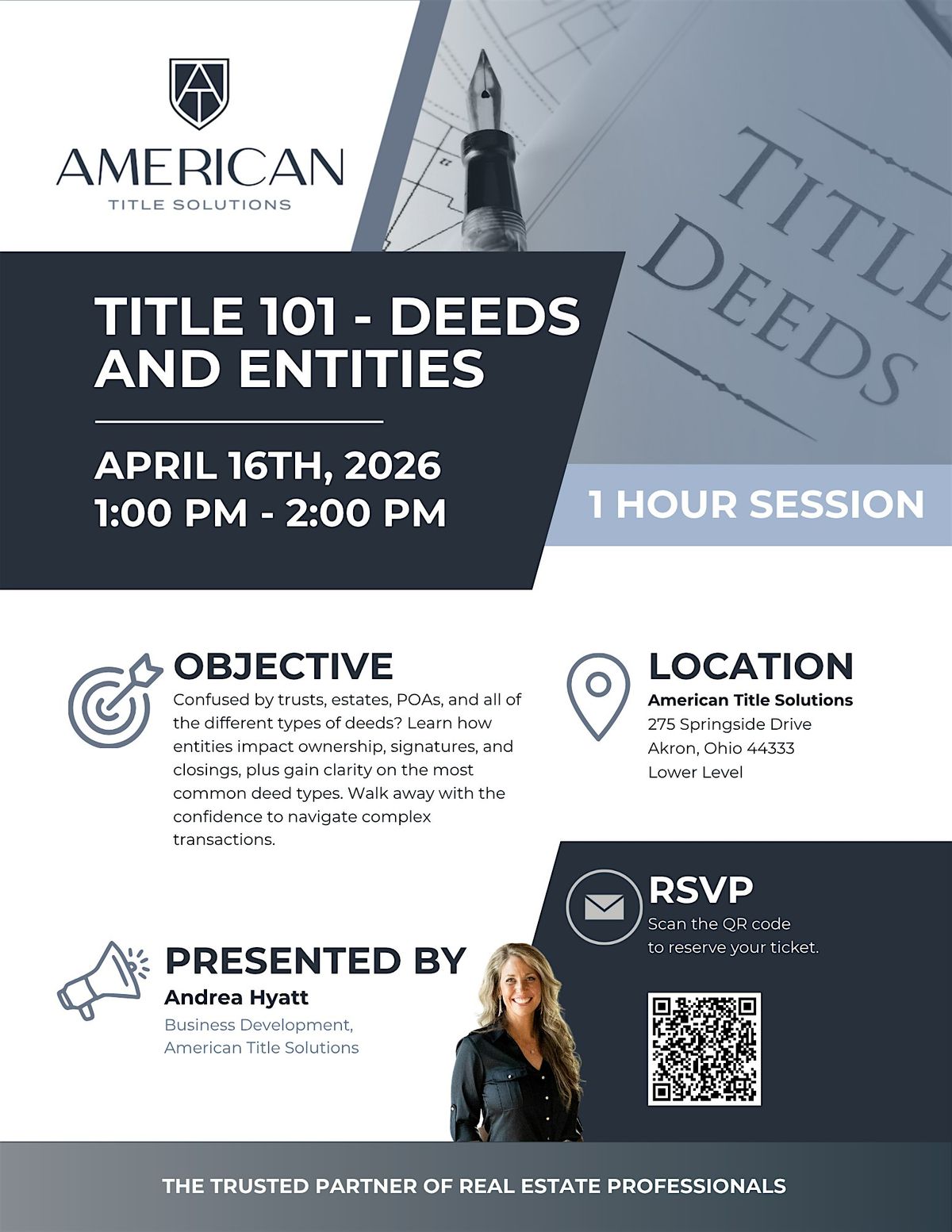 Join Andrea Hyatt and American Title Solutions for this 1 hour session on Deeds and EntitiesAbout this Event