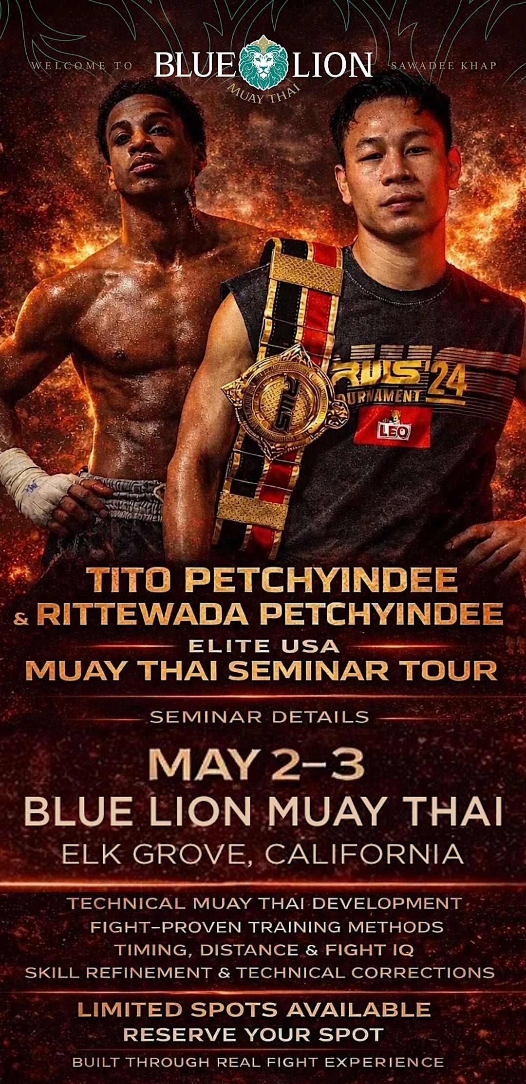 Blue Lion Muay Thai is proud to host Tito Petchyindee and Rittewada Petchyindee for a special two-day seminar in Elk Grove, California.