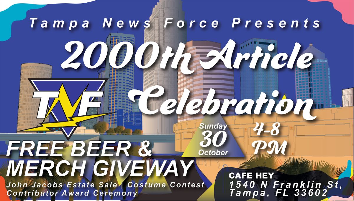Tampa's hyperlocal satire and 24 hour live Twitch stream parody news source is publishing its 2000th article. Join John Jacobs, Josh Santos and Clark Brooks as they give away free beer and merch to celebrate this milestone. We will be commemorating all of our contributors with a special contributor award ceremony as well as some special live performances.
