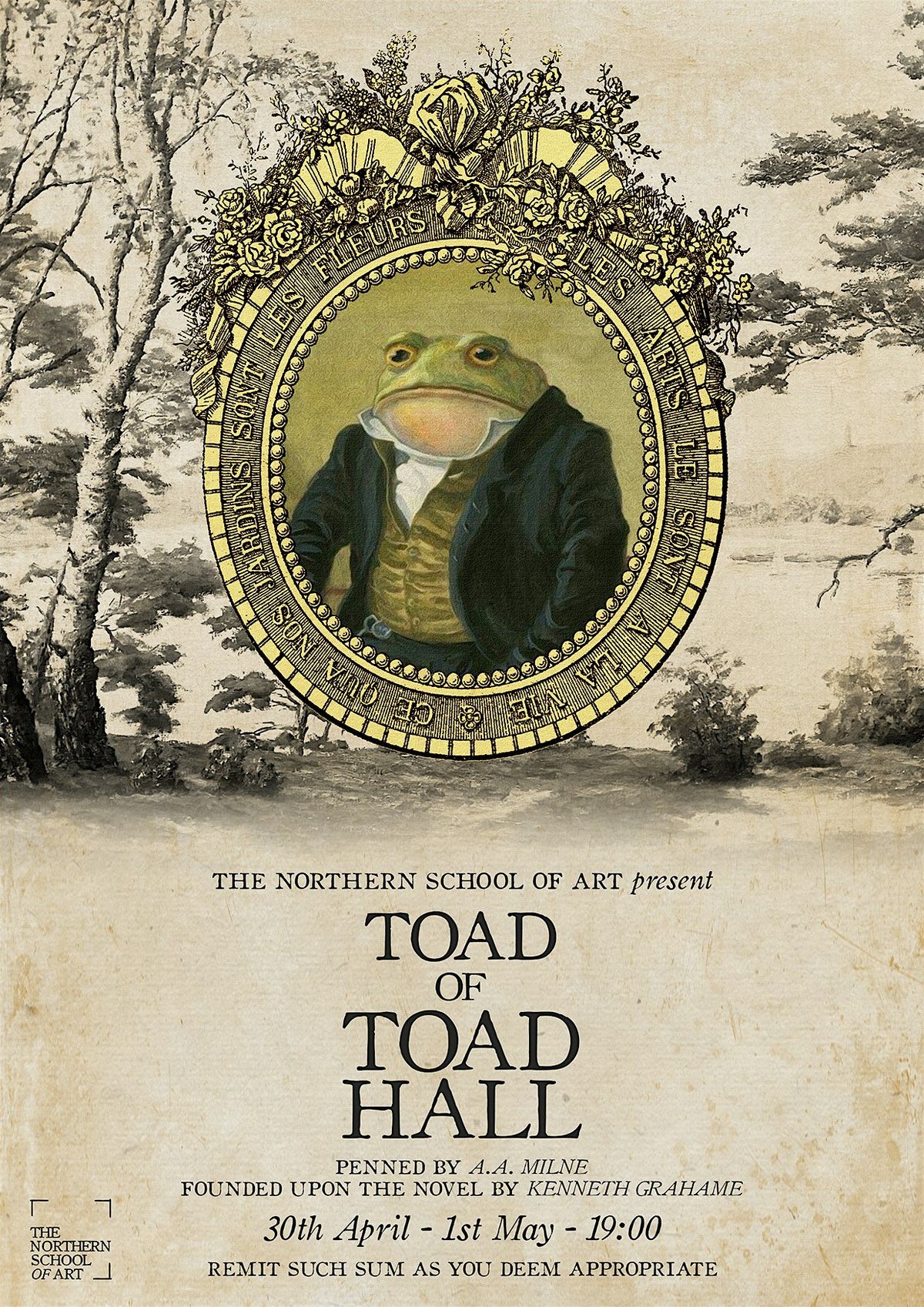 The Northern School of Art presents a new retelling of A. A. Milne’s Toad of Toad Hall, the stage adaptation of Kenneth Grahame’s beloved novel The Wind in the Willows, centering on the exuberant and irresponsible Mr. Toad and the steadfast loyalty of his friends, Mole, Rat, and Badger. We follow them on their grand adventures and mischievous mishaps from the beautiful and friendly riverbanks to the dark and dangerous wild woods, from the darkest dungeon where Toad has been imprisoned to his great escape and onto the Battle for Toad Hall. We promise you fun and frolics with a cast of endearing characters in this joyful and hilarious production. “Poop Poop”
