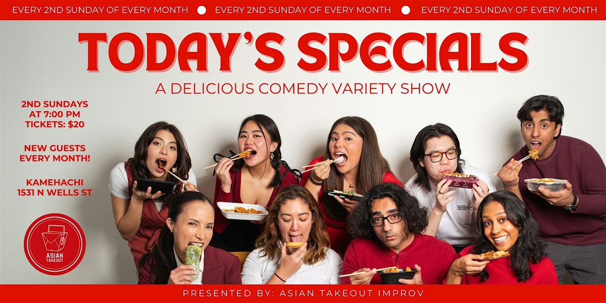 "Today's Specials" is an hour long variety show hosted by Asian Takeout Improv, featuring Chicago's best comedians, musicians, performers and improvisers. We strive to highlight comedians and performeres of AANHPI descent.