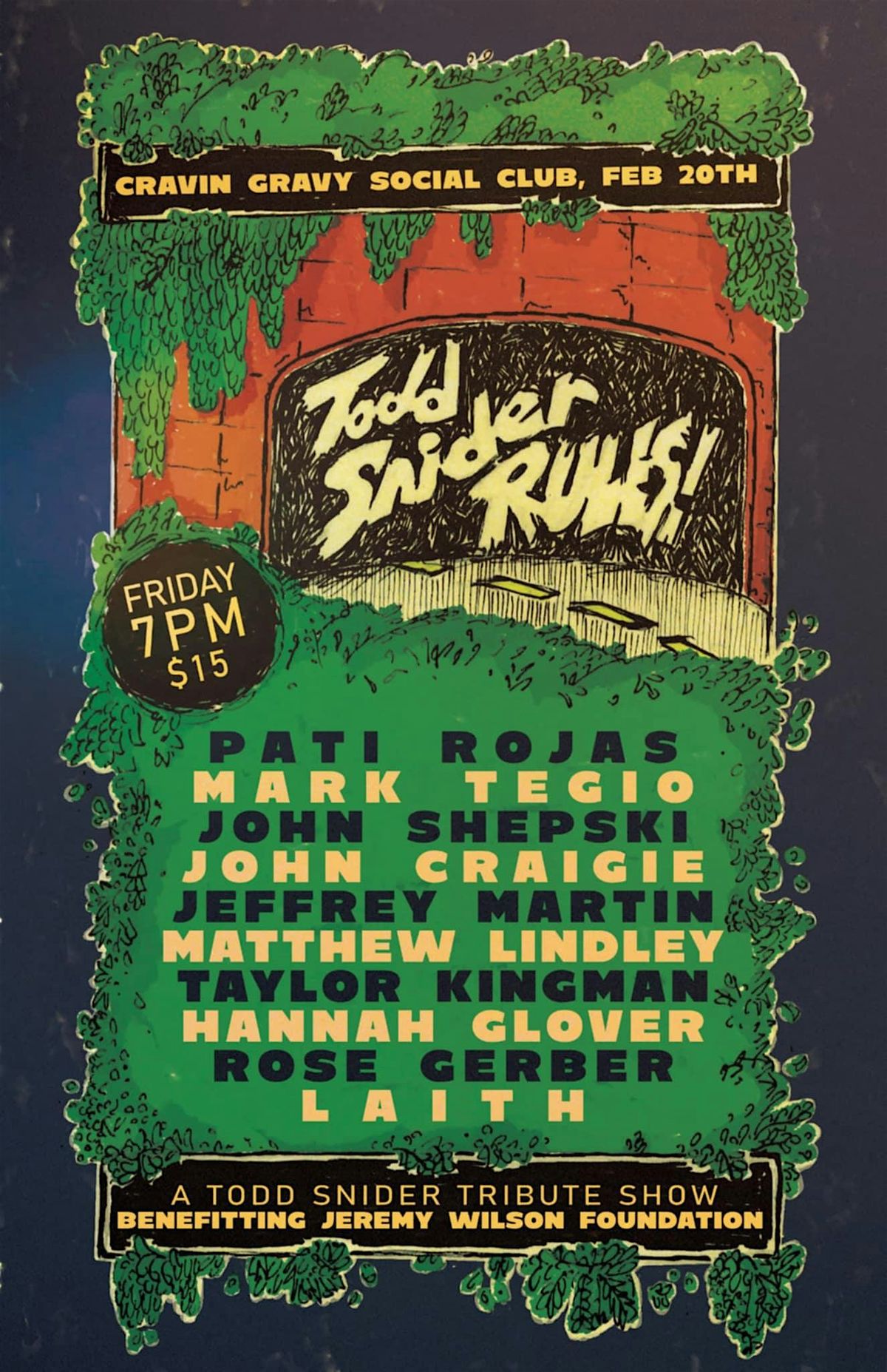 Join us at Cravin' Gravy Social Club on Friday, February 20 as we celebrate the life and music of Oregon icon Todd Snider. We will have 10 local artists interpreting Todd's music, ranging from solo to full band performances. Proceeds fromt he event will go toward Mental Health Wellness for musicians via the Jeremy Wilson Foundation.