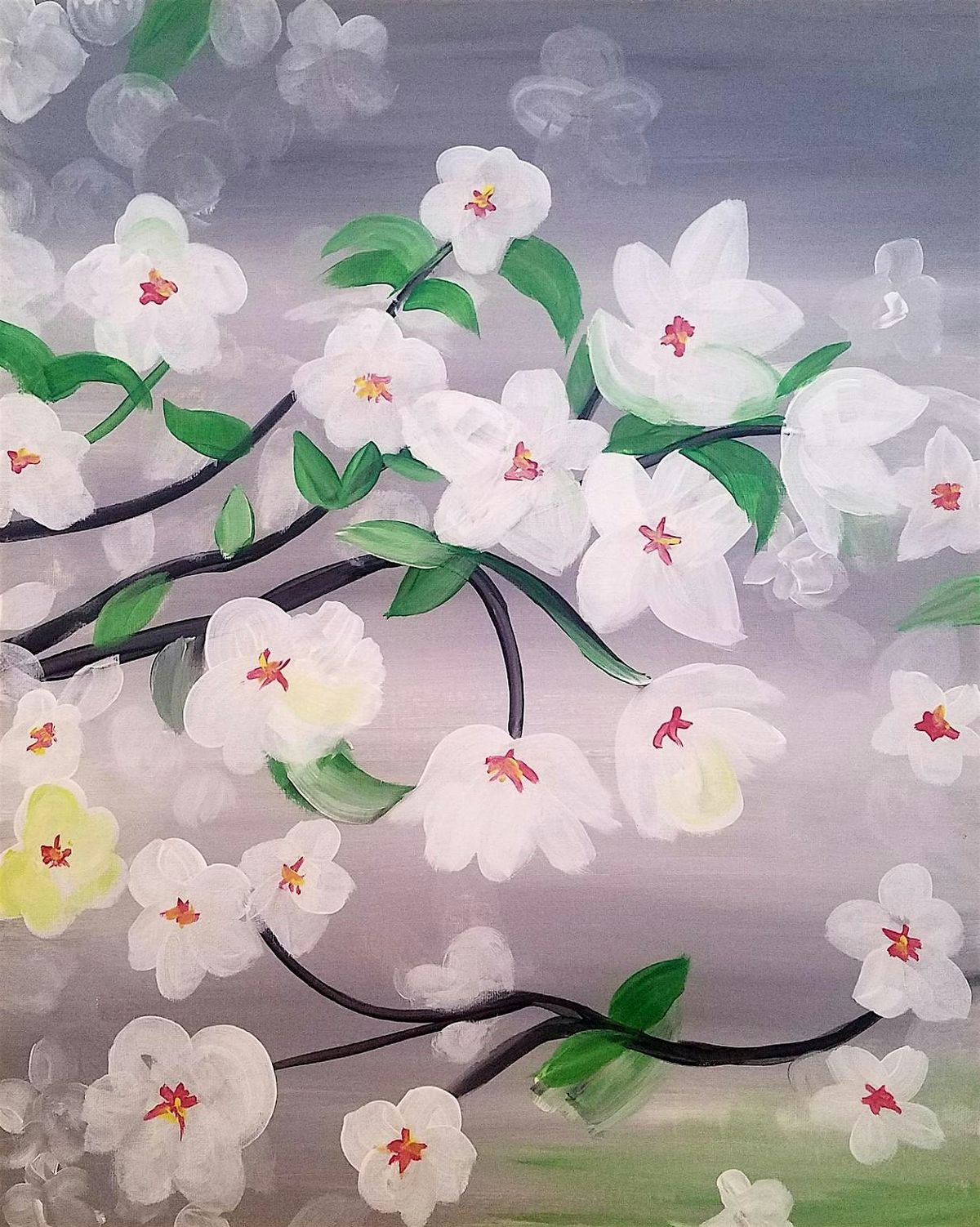 Join us at Wine & Canvas Studio for Beautiful Flowers, a graceful Paint & Sip experience inspired by delicate orchid blossoms. Flowing branches of white flowers stretch across a soft gray background, while gentle highlights and vibrant green leaves add contrast and movement.