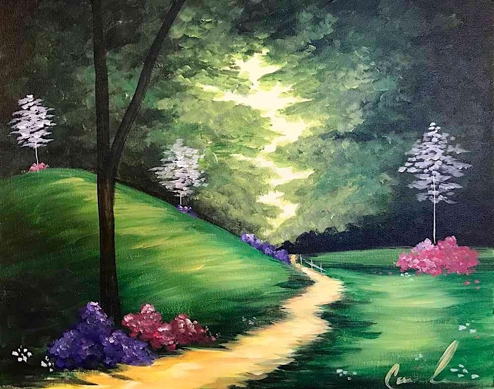 Join us at Wine & Canvas Studio for Glowing Garden Path, a calming Paint & Sip experience inspired by quiet gardens and hidden trails. This enchanting design features a winding path glowing with soft light as it curves through rolling green hills, blooming flowers, and gently shaded trees.