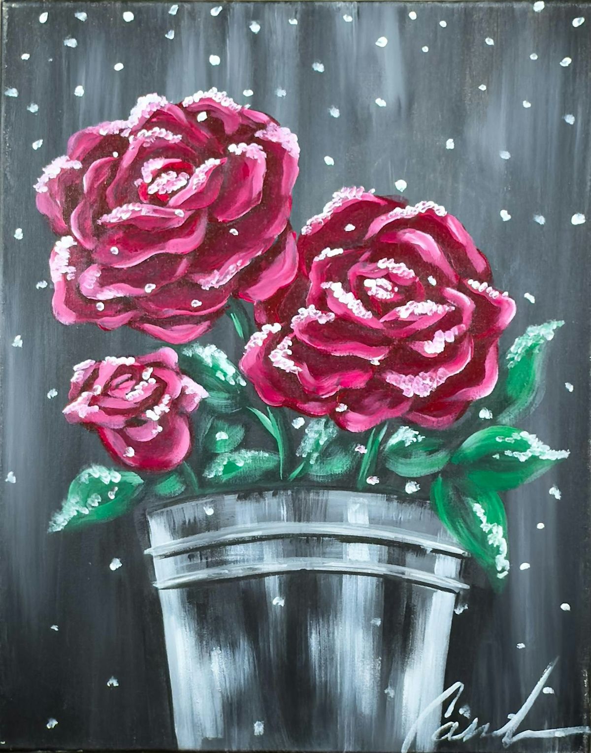 Our talented local artist will guide you step by step as you paint your own 16×20 Snow-Kissed Roses canvas — no painting experience needed!