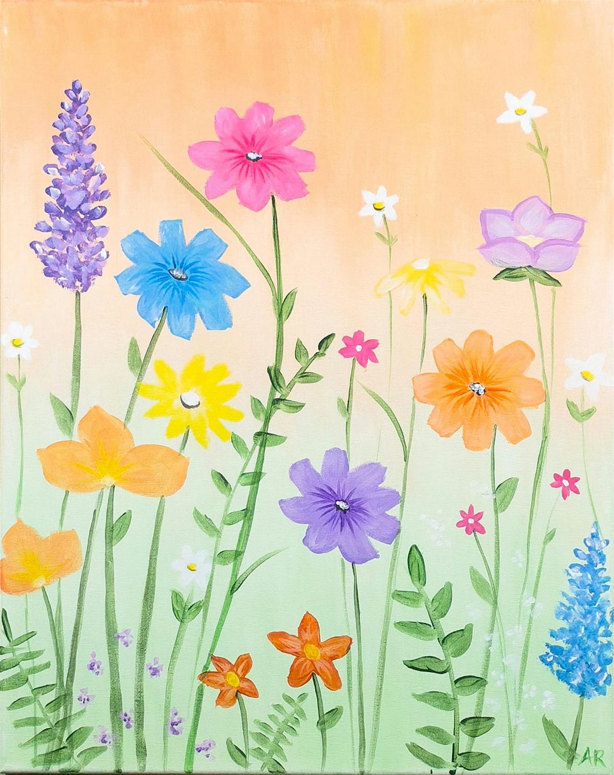 Playful brushstrokes, simple floral shapes, and gentle color blending make this painting relaxing, expressive, and perfect for beginners. Every canvas turns out beautifully unique, just like a real wildflower field.