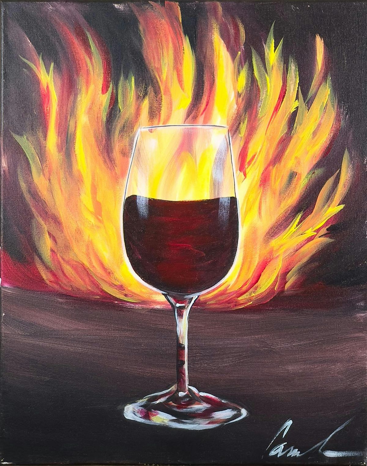 Join us at the Wine & Canvas Studio for Wine on Fire, a bold and dramatic Paint & Sip Party featuring a glowing glass of red wine set against roaring flames. Rich reds, fiery yellows, and deep shadows create a striking contrast that makes this painting powerful, eye-catching, and full of intensity.