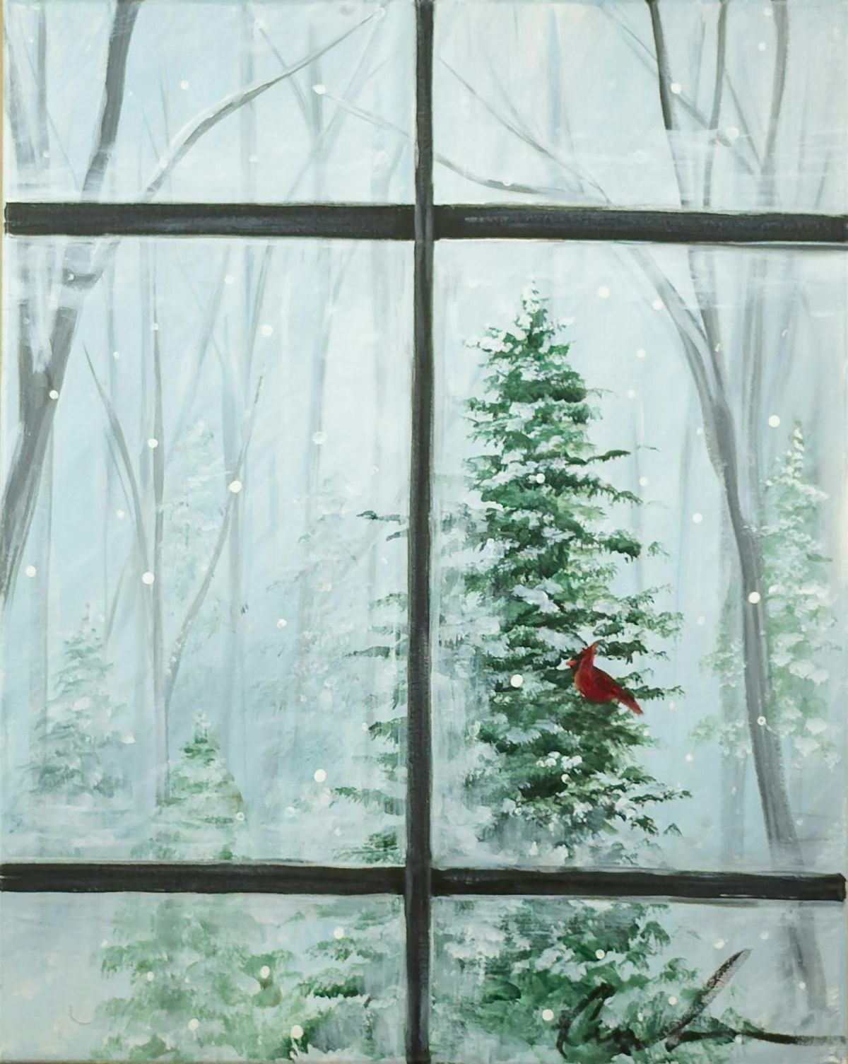 Guided step-by-step by one of our talented local artists, you’ll create your own 16×20 Winter Window canvas — no painting experience needed!