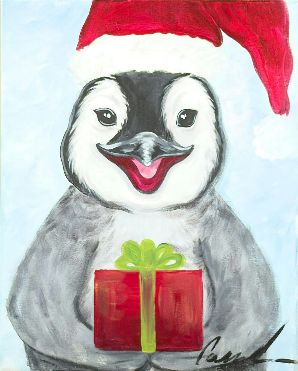 Guided by our talented local artist Paradyse, you’ll create your own 16×20 Christmas Penguin canvas step-by-step — no experience needed!