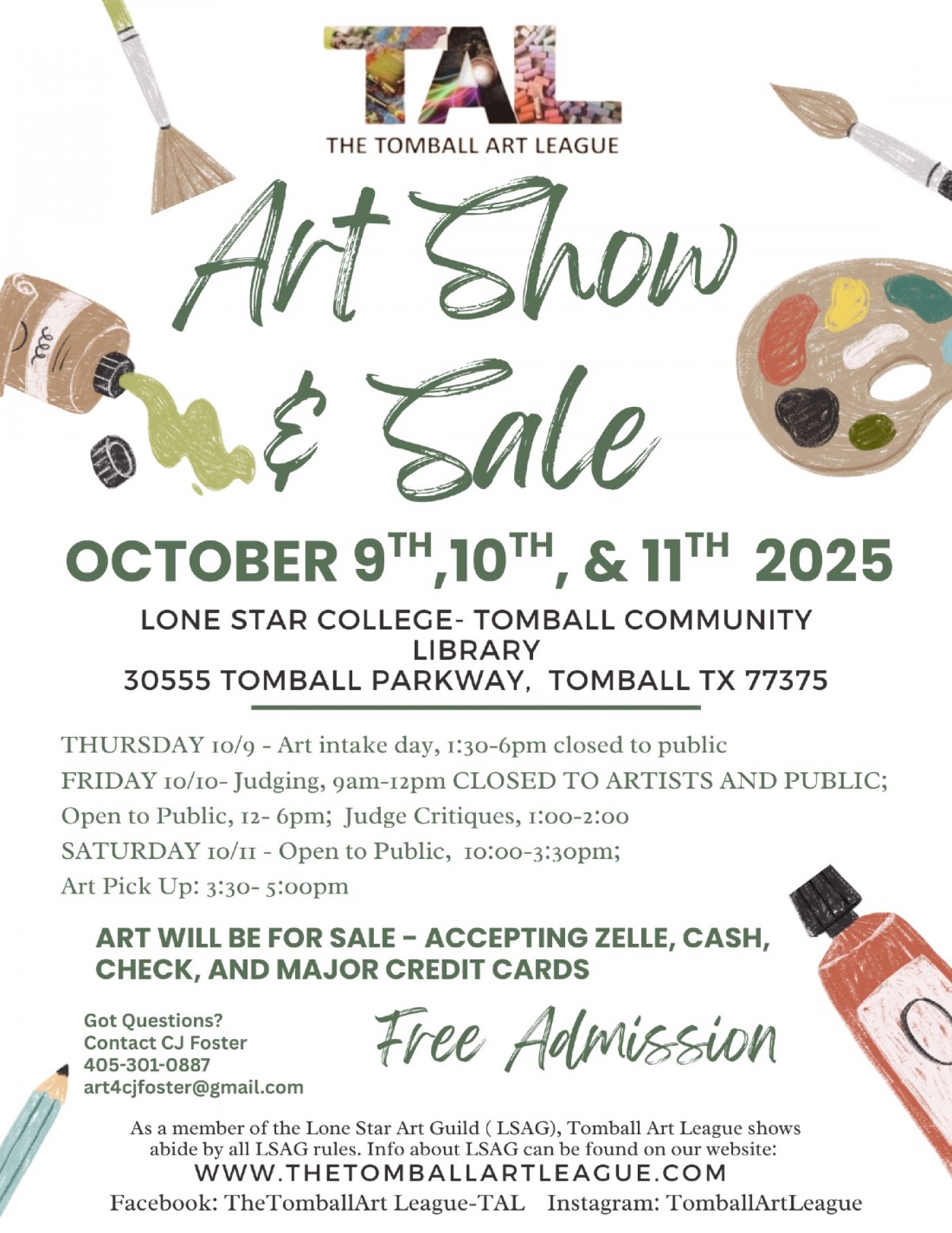 The Tomball Art League Fall Art Show and Sale will be open to the public on Friday October 10th from 12-6pm and Saturday October 11th from 10am-3:30pm at Lone Star College-Tomball Community Library. This free family-friendly event is a great opportunity for the community to see and purchase original artwork as well as visit with area artists. For more information please visit www.thetomballartleague.com.