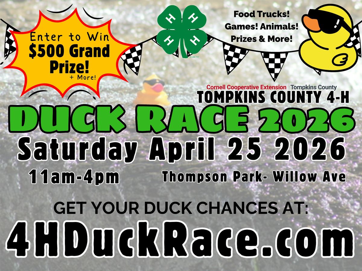 Tompkins 4-H proud to announce that the annual Duck Race will take place on Saturday, April 25, 2026 from 11am-4pm.