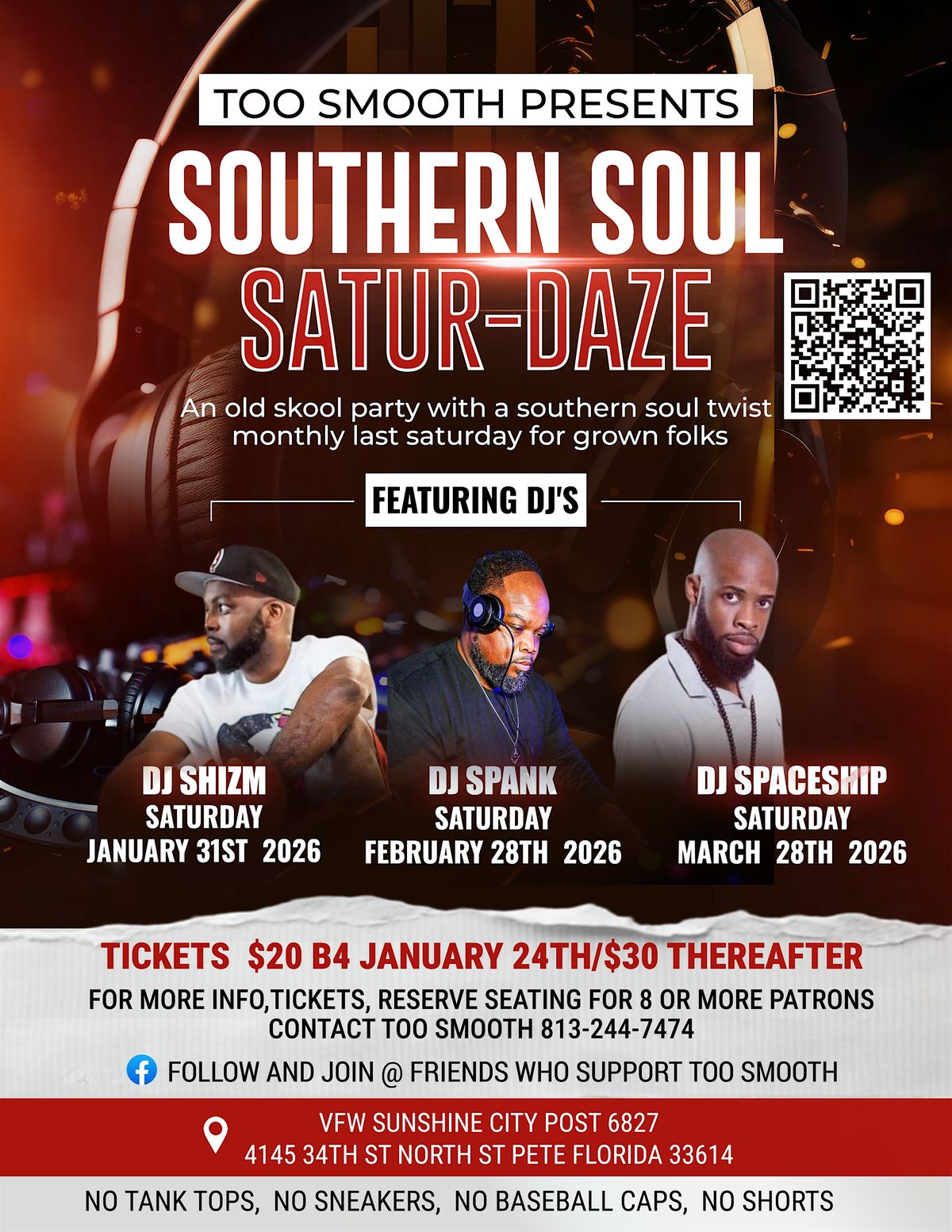 TOO SMOOTH SOUTHERN SOUL SATUR-DAZE "AN OLD SKOOL PARTY WITH A SOUTHERN SOUL TWIST EACH AND EVERY LAST SATURDAY OF THE MONTH...FOR THE GROW