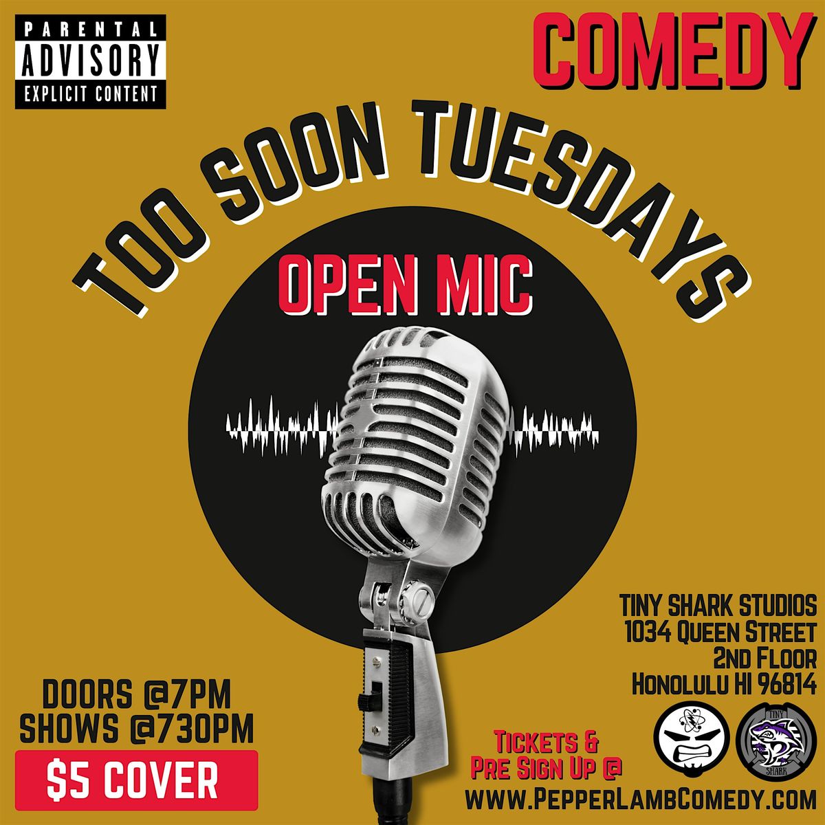 Get ready to laugh your socks off at Too Soon Tuesdays! This is your weekly dose of hilarity where local comedians and fresh talent take the stage to deliver quick wit and sharp jokes. It's an in-person event, perfect for anyone who loves a good chuckle and a relaxed vibe. Whether you're performing or just here to enjoy, bring your friends and your best laugh! Don't miss out on the fun — see you Tuesday!
