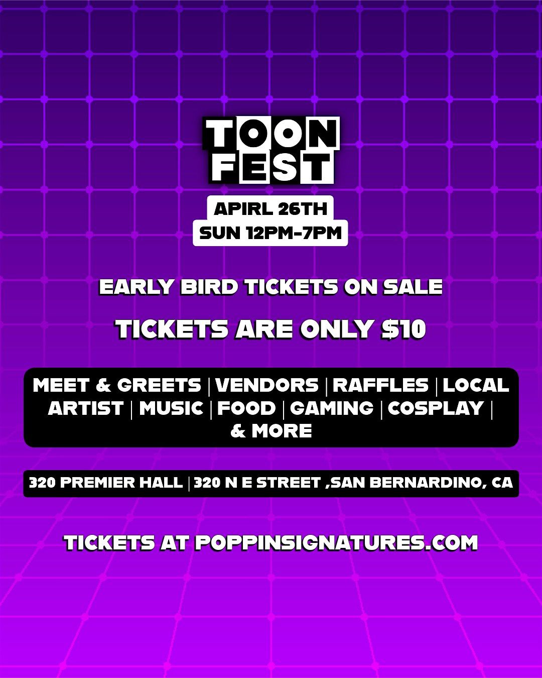 Get ready for TOON FEST happening at 320 N E St! Join us on April 26, 2026 at 12:00 PM (PDT) for a fun-filled day celebrating all things cartoons. Whether you're a fan of classic animations or the latest hits, this event is perfect to hang out, meet fellow fans, and enjoy some cool activities. Don’t miss out on the fun and good vibes — see you there!