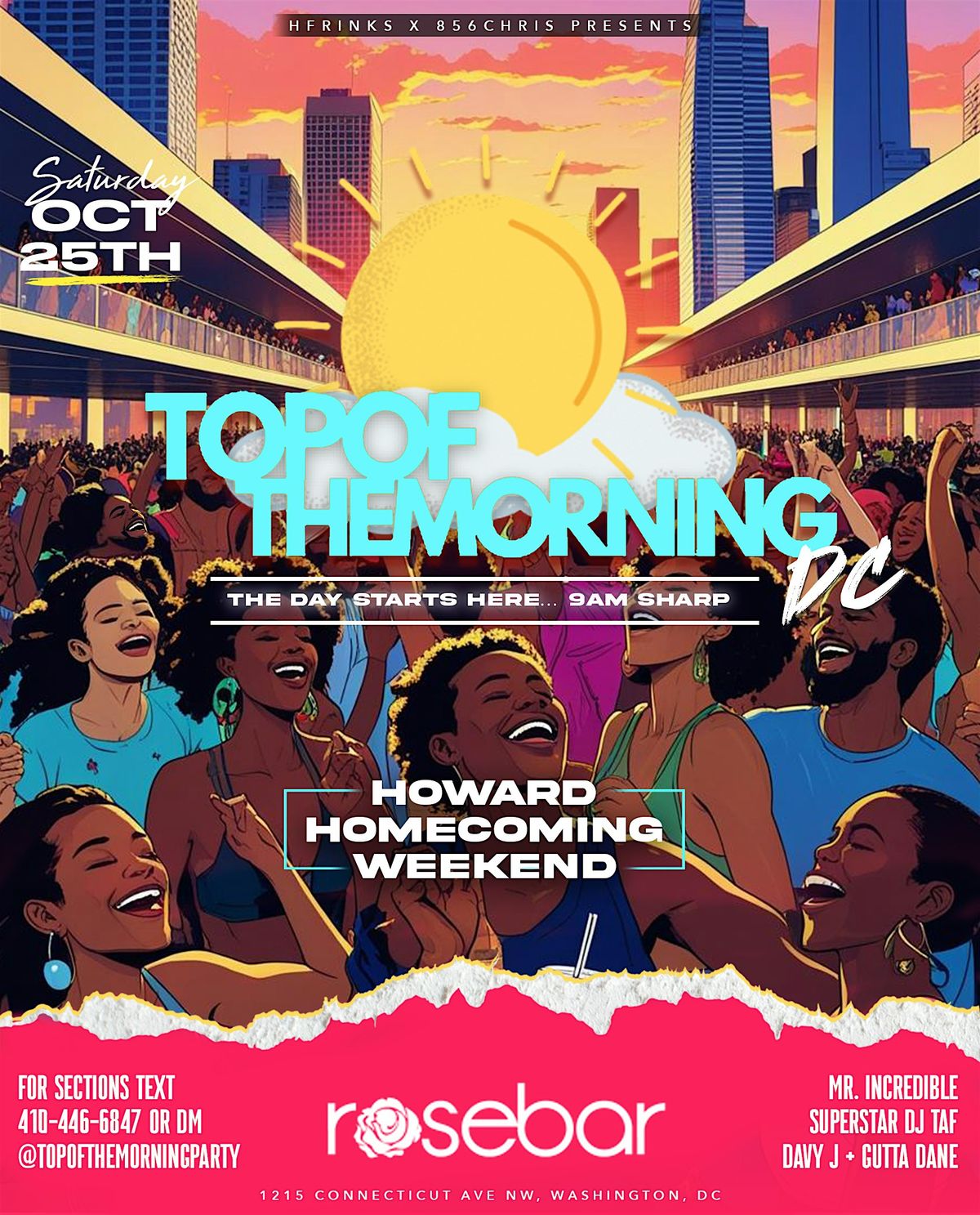 Welcome to the TOP OF THE MORNING PARTY DC! Get ready to kick off your HOWARD HOMECOMING WEEKEND with a bang at ROSEBAR. Join us on October 25, 2025 at 9:00 AM for a morning filled with music, dancing, and good vibes. Don't miss out on the chance to start your day on a high note!