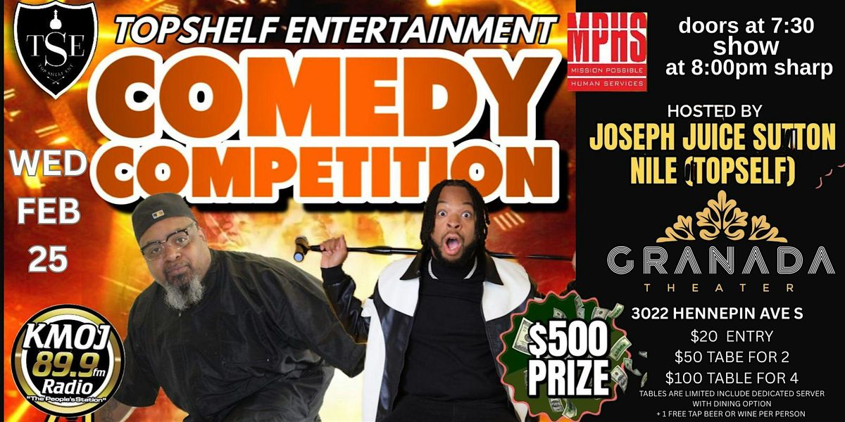 Welcome to the Top ShelF Entertainment COMEDY COMPETITION at the Granada Theater! Get ready to laugh until your stomach hurts on February 25, 2026 at 7:00 PM Doors. Join us for a night filled with hilarious stand-up acts and see who will be crowned the funniest comedian of the night. Bring your friends and family for a memorable evening of laughter and entertainment. Don't miss out on this epic comedy showdown!