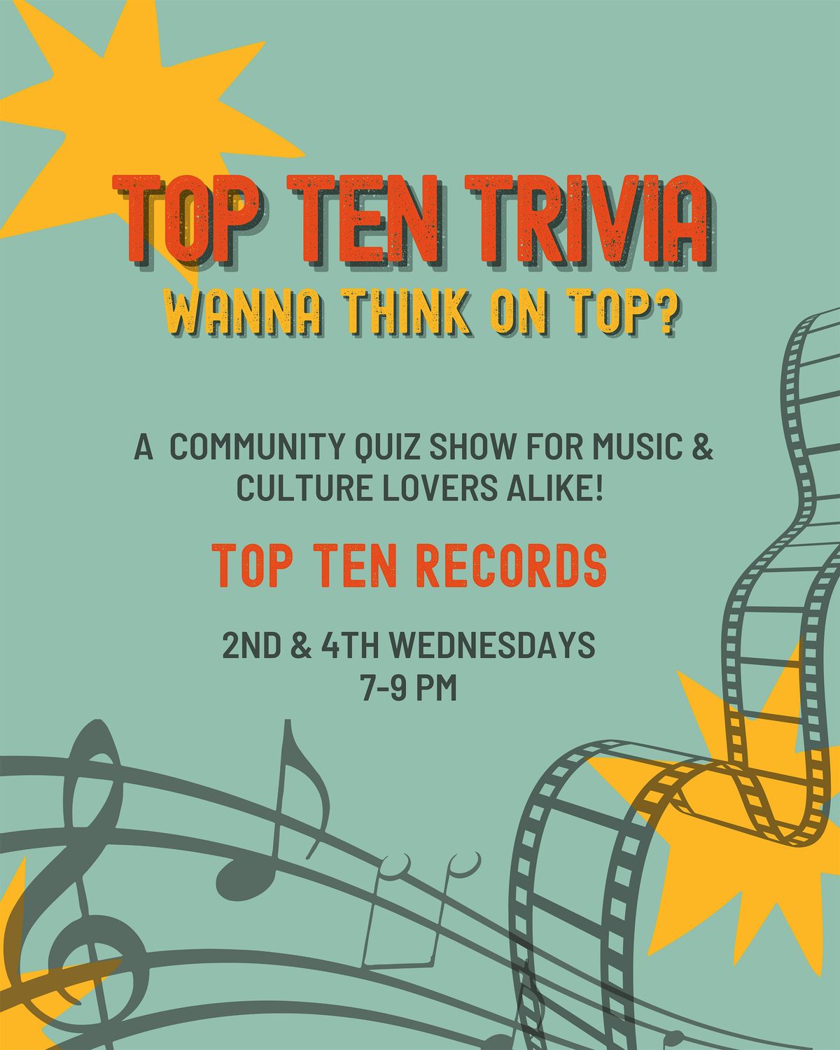 Trivia nights at Top Ten Records are a fast-paced community quiz show for music & culture lovers alike! Whether correctly guessing song titles, recalling an artist's middle name or yelling out the latest pop culture reference, Top Ten Trivia has an exciting blend for all to enjoy! With refreshments and prizes, Top Ten Trivia is a great way to spend a 5-9 after your 9-5.