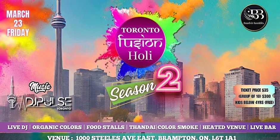 Tickets available at https://indianeverywhere.com/events/toronto-fusion-holi-season-2/Get ready for an explosive burst of colors and festivities at TORONTO FUZION HOLI – Season 2, presented by the sensational Bandish Banddits!