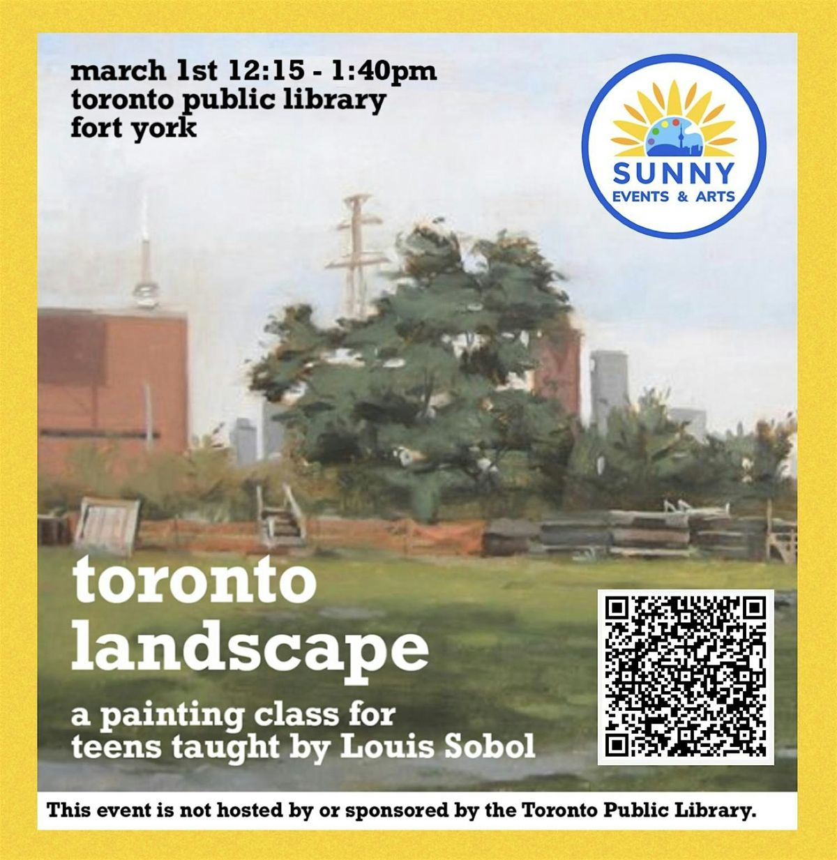 In this creative workshop, teens will design and paint a Toronto-inspired landscape—real or imagined—that reflects the spirit of this vibrant city. Using reference images of iconic Toronto landmarks, participants will explore composition, perspective, and positive and negative space while creating a unique acrylic painting.