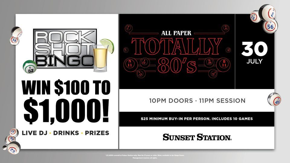 Join us for our Totally 80's All Paper Rock Shot BingoDoors: 10 PM | Start: 11 PM