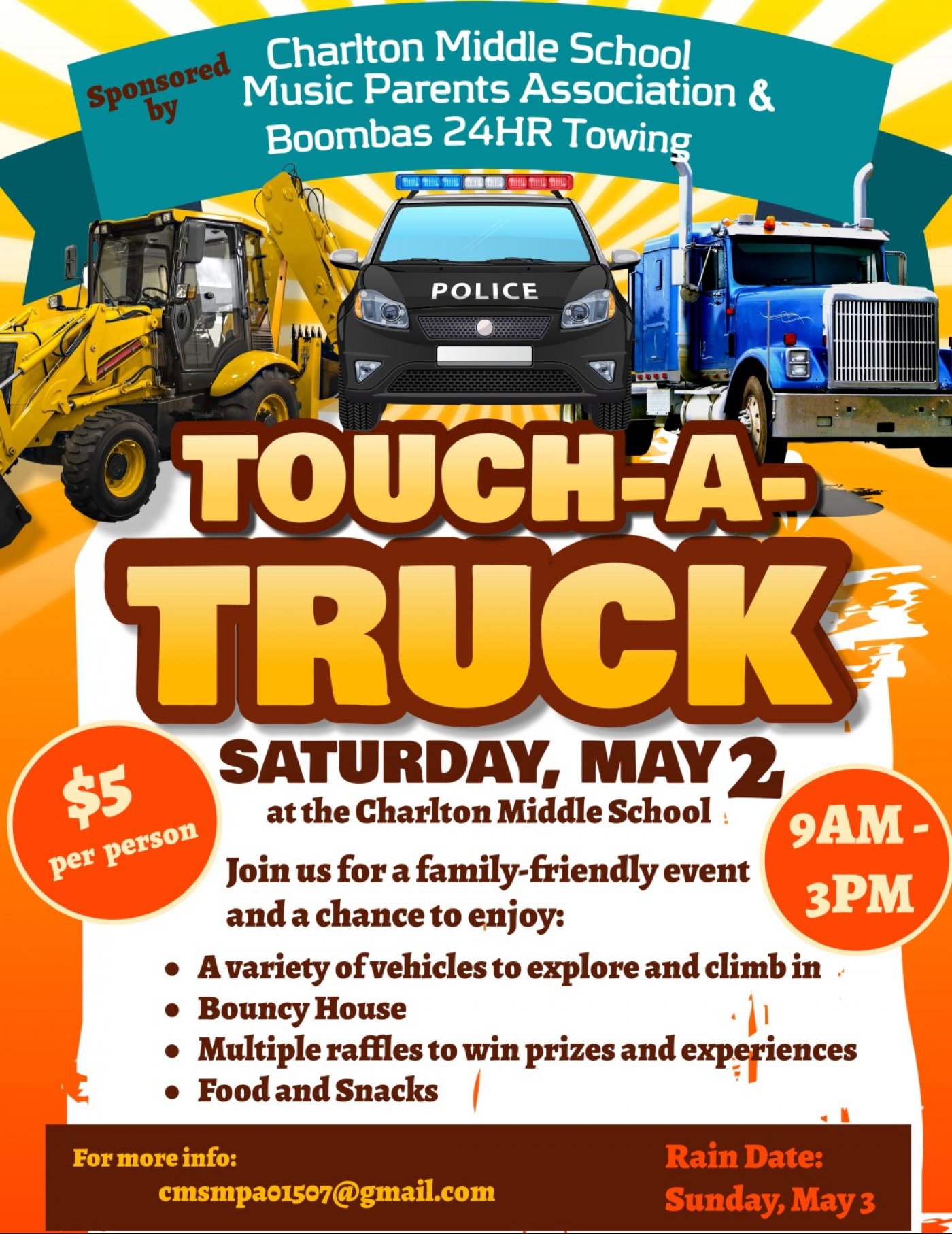 Come join us May 2nd from 9-3 (rain date is May 3rd) at the Charlton Middle School for our Touch a Truck Fundraiser! We will have a variety of vehicles, a bounce house, multiple raffles, face painting, food trucks and more! Come explore all the vehicles, watch Life Flight land on the field, visit with the State Police horses and more! $5 per person. 100% of the proceeds go directly to the Charlton Middle School Music Department and benefits the kids! http://bit.ly/3R2IGKE