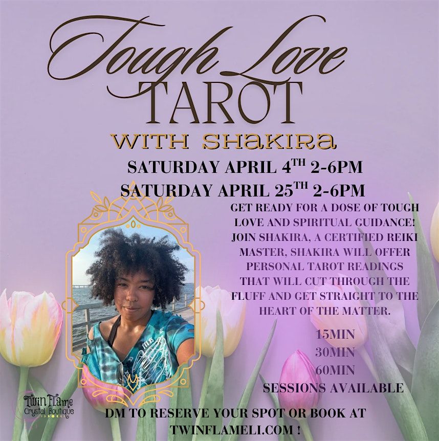 Discover the mystical insights of Shakira, a talented tarot reader, empath, goddess, and Reiki Level 3 practitioner, on Saturday, April 4th, from 2-6pm. Shakira will be offering transformative tarot readings to illuminate your path and provide deep spiritual guidance.