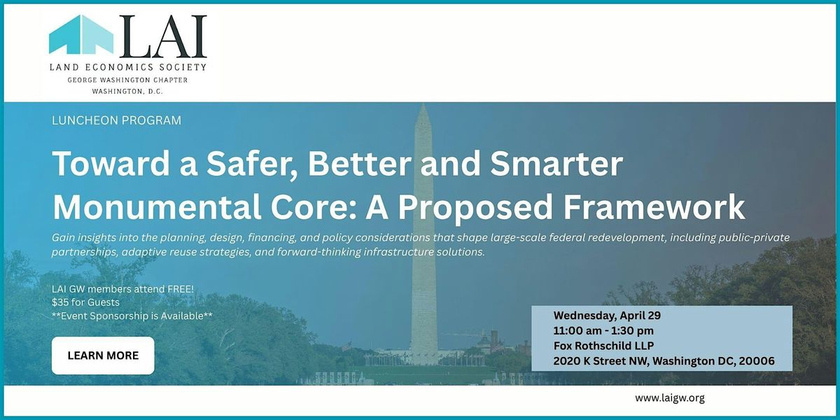 Join the George Washington Chapter of Lambda Alpha International (LAIGW) for an engaging discussion on shaping the next century of Washington’s Monumental Core, led by James Snyder, Former Director of Planning and Economic Development, City of Falls Church, Lu Hou, Principal in Urban Design, Cityscapes Associates International, and John Dugan, FAICP, Former Director of Long-Range Planning, NCPC.