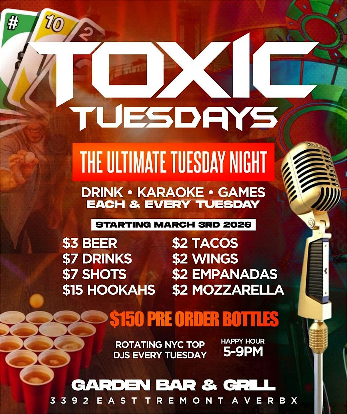 oin us every Tuesday at Garden Bar & Grill, located at 3392 East Tremont Ave, BX, for the ultimate night out with friends! Experience "Toxic Tuesdays," where fun meets entertainment with exciting drink specials, delightful food options, and live music from NYC's top DJs.