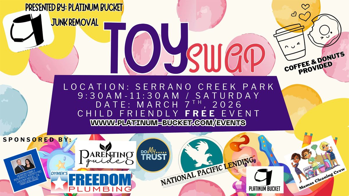 Calling all Lake Forest, CA, Mission Viejo, CA and surrounding area families! Join us on March 7th from 9:30 AM to 11:30 AM for a fun and family-friendly Toy Swap Event. Bring gently used toys that your little ones have outgrown and exchange them for a “new-to-you” treasure. It’s a great way to refresh your child's toy collection while giving back to the community.Event Highlights:Swap gently used toys with other families