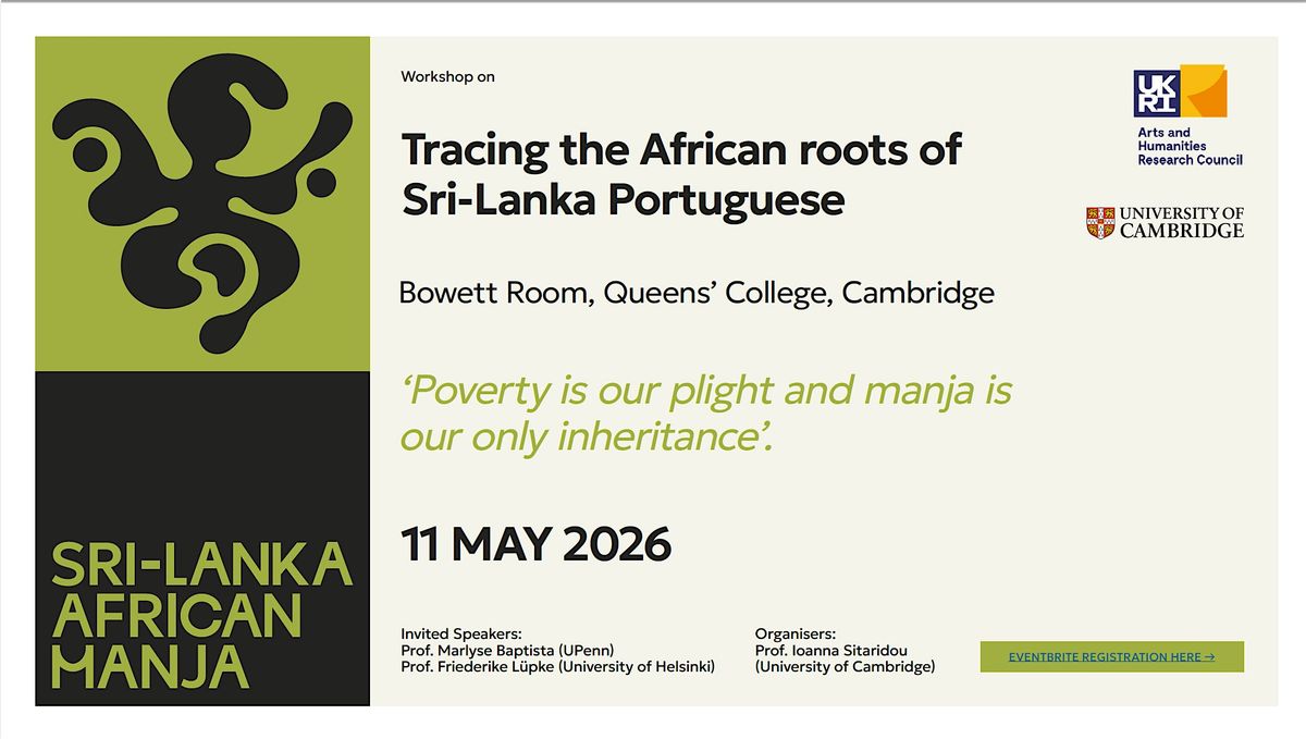 The purpose of this workshop is to discuss a critically endangered language—Sri Lanka Portuguese (SLP)—among Afrodescent communities in north-western Sri Lanka. With the help of experts on Creoles, Language Contact, Multilingualism and African Languages, we will present our documentation practices and our preliminary analyses of the manja, the only remaining linguistic and cultural expression of African heritage for these communities; in the words of the speakers themselves ‘Poverty is our plight and manja is our only inheritance’. We hope to give visibility to their only inheritance through careful documentation combining state-of-the- art theorising with the ethnographic method which has taken place as part of our UKRI-AHRC-funded project.