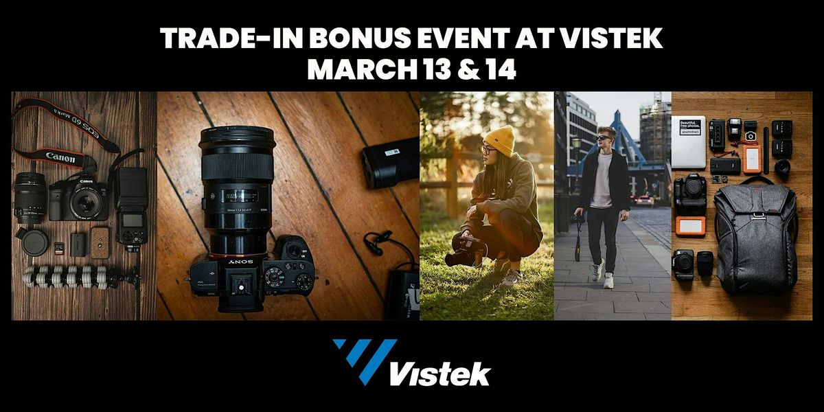 Use your trade-in value to shop for new gear at Vistek and receive a 10% Bonus + up to an extra 15% bonus from select brands for you to use towards the purchase of a new Camera or Lens.