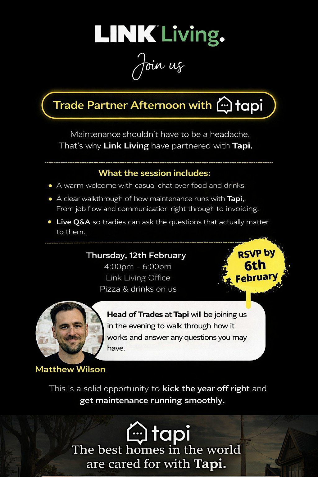 We’re hosting a Trade Partner Afternoon at the LINK Living office with our maintenance partner TAPI, and we’d love you to join us.