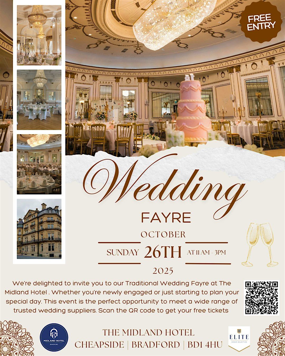 We’re delighted to invite you to our Traditional Wedding Fayre at The Midland Hotel on Sunday, 26th October 2025, from 11:00 AM to 3:00 PM.