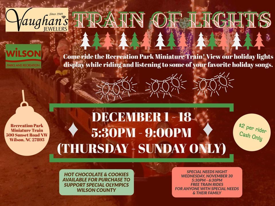 Come ride the Recreation Park Miniature Train! View our holiday lights display while riding and listening to some of your favorite holiday songs. Tickets are $2 per person (Cash only)!Hot Chocolate & Treats available for purchase to support Special Olympics Wilson County!