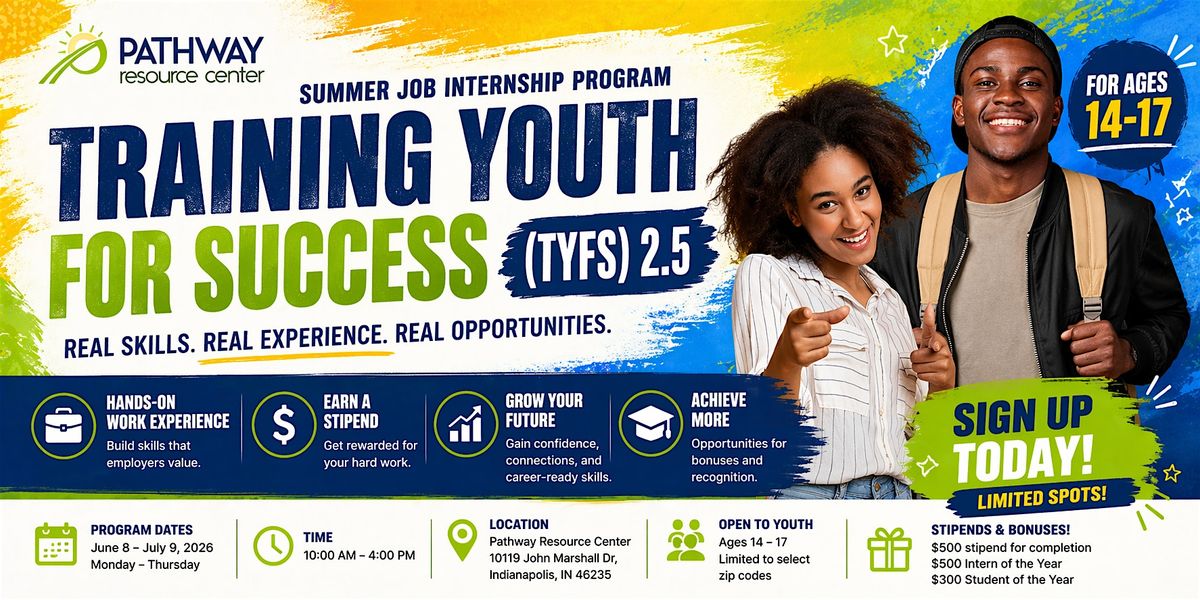 The Training Youth for Success (TYFS) 2.5 program is a dynamic summer job internship and employment skills training experience designed for youth ages 14–17. Hosted by Pathway Resource Center, this program equips young people with the tools, confidence, and real-world exposure needed to succeed in today’s workforce.