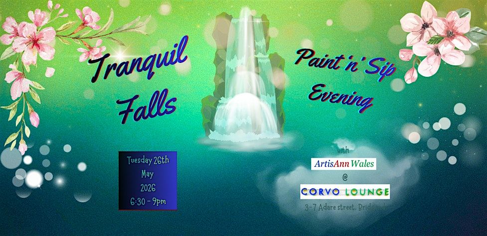 Join us for Tranquil Falls, a waterfall-themed Paint & Sip evening at Corvo Lounge, Bridgend, on Tuesday, 26th May at 6:30pm.