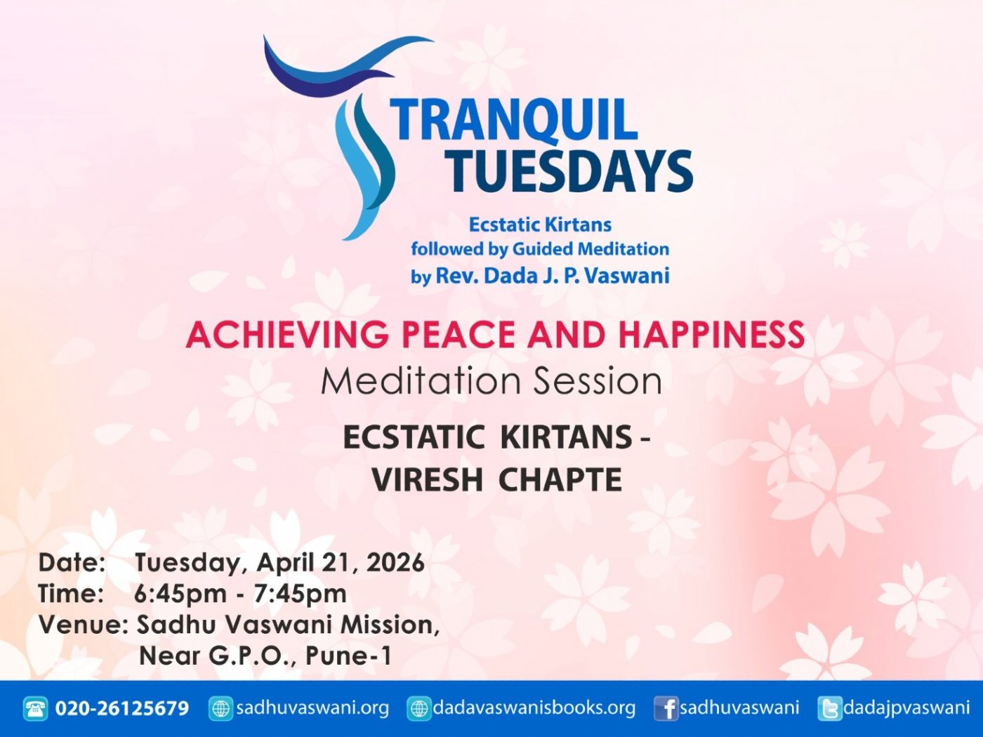 Tranquil Tuesdays is held every week from 6:45 p.m. to 7:45 p.m. at the Sadhu Vaswani Mission Pune. These peace-filled sessions include a trendy mix of kirtans performed by accomplished guest singers followed by a guided meditation in English by Dada J.P. Vaswani.