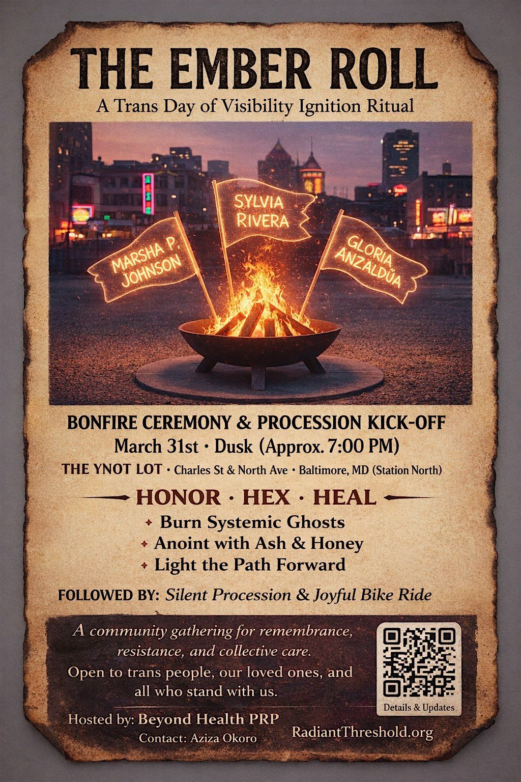 Trans Day of Visibility bonfire ceremony & procession. Honor lineage, release what no longer serves, light the path forward. Join us."
