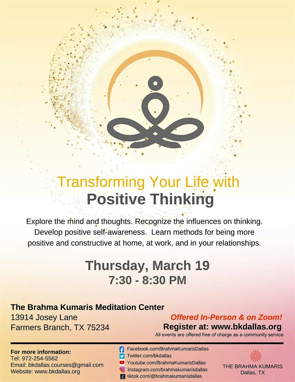 Join us for an uplifting online session on Transforming Your Life with Positive Thinking. This one-hour Session will help you better understand your thoughts and learn practical ways to create a more positive, balanced, and constructive mindset.