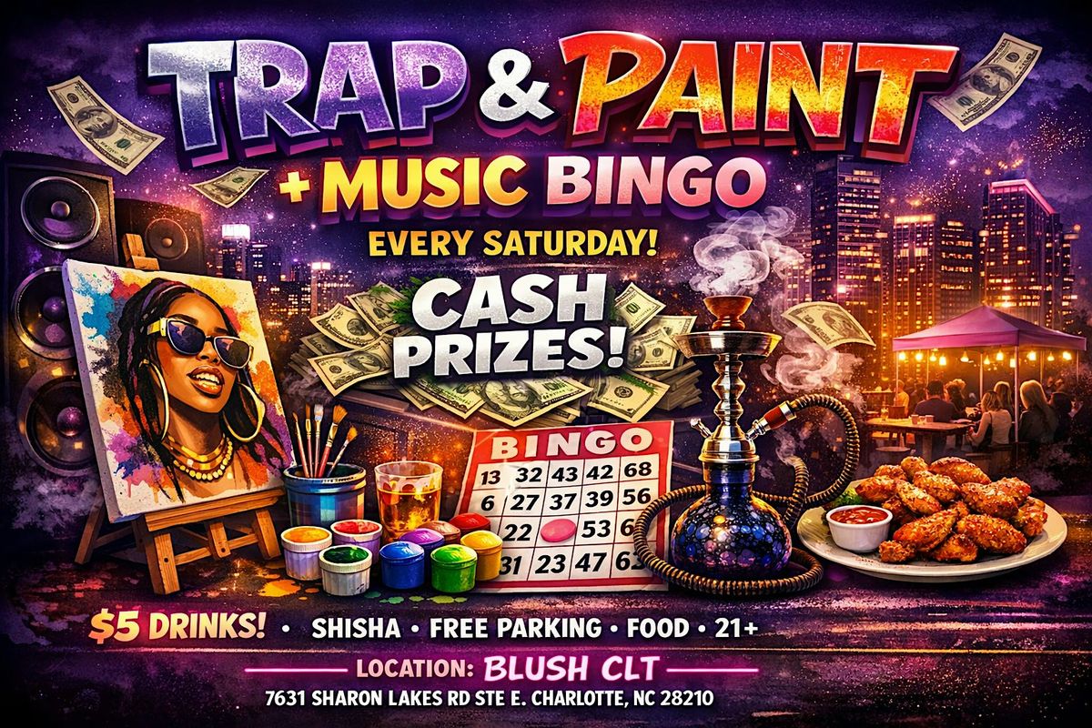 Season 9 of the Queen City Urban Art Showcase presents "Trap & Paint + Music Bingo" every weekend! Sip & Paint to hard hitting trap music, hiphop, reggae, and r&b. Located in the newest lounge in the South Charlotte area. Music by the best DJ's in town. Limited space available so get your tickets asap. Hosted by Freaky Tai the #1 showstopper in Charlotte! Food truck onsite, $5 drinks, and $25 hookahs round out this wonderful event!
