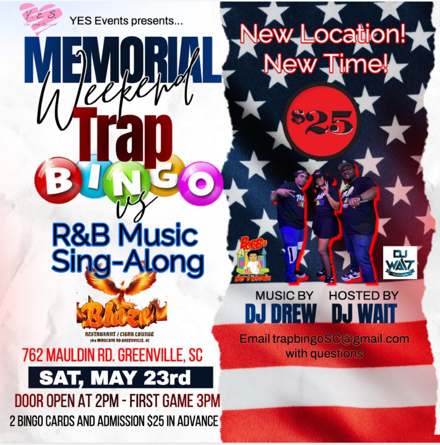 Join Trap Bingo, Upstate at 🔥 Blaze Lounge in Greenville for an electrifying showdown between Trap Bingo and R&B Music Sing-Along 🎶 on May 23, 2026, starting at 2:00 PM. Get ready for an unforgettable experience at 🔥 Blaze Cigar Lounge, located at 762 Mauldin Rd, Greenville.