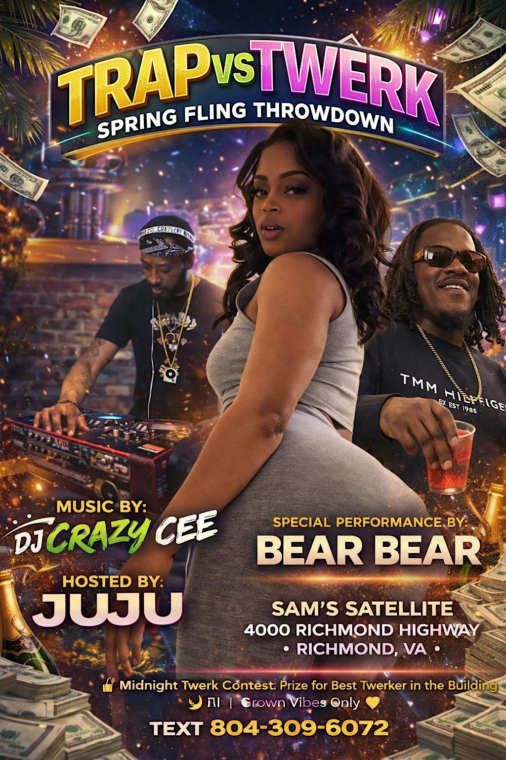 Trap vs Twerk Spring Fling Throwdown 9:30om til 2am Hosted By JUJU PERFORMANCE BY BEAR Vibes DJ CRAZY CEE GREAT WEATHER GREAT TIME